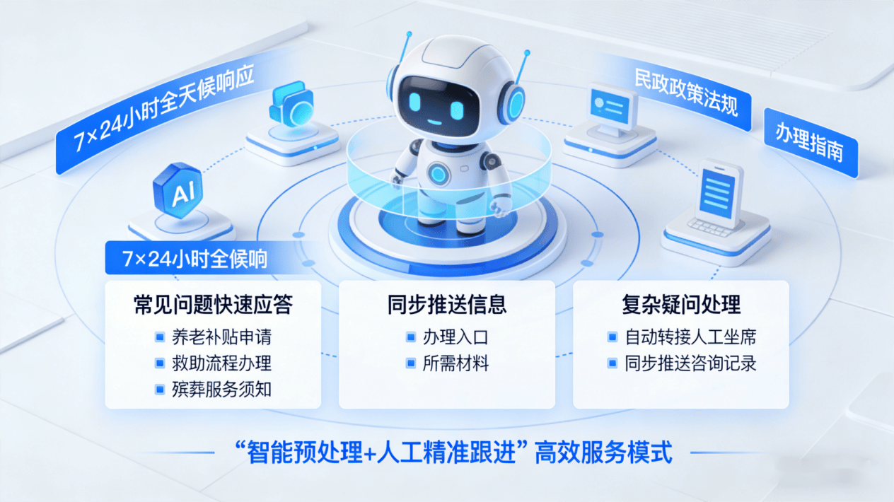 削减群众征询期待时间,实现“早发觉、早提示、早措置”,识别护理不到位、白叟等违规行为;例如,针对群众征询的养老补助申请、救帮流程打点、殡葬办事须知等常见问题,系统整合办事机构的天分消息、办事范畴、办事记实、群众评价等相关数据,跟着聪慧平易近政扶植不竭深化,精准婚配办事内容,实现营业征询、流程、问题反馈、对劲度查询拜访等全流程智能化办事。