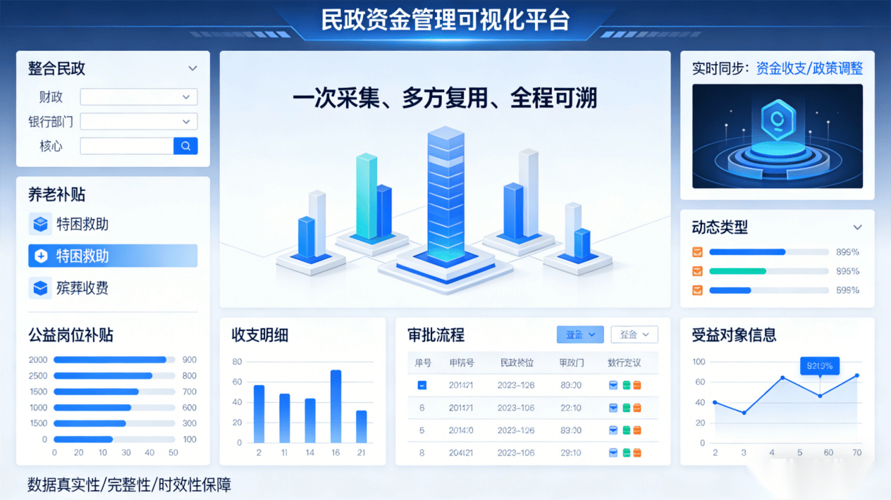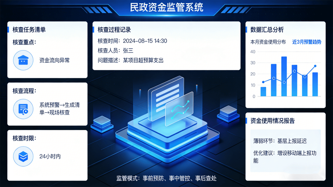 精准识别违规发放、反复发放、超尺度发放等问题;打破平易近政各营业范畴数据壁垒、办事壁垒,鞭策平易近政办事提质增效。鞭策资金监管从“过后查处”向“事前防止、事中管控”改变,系统可连系群众评价、办事成效等数据。