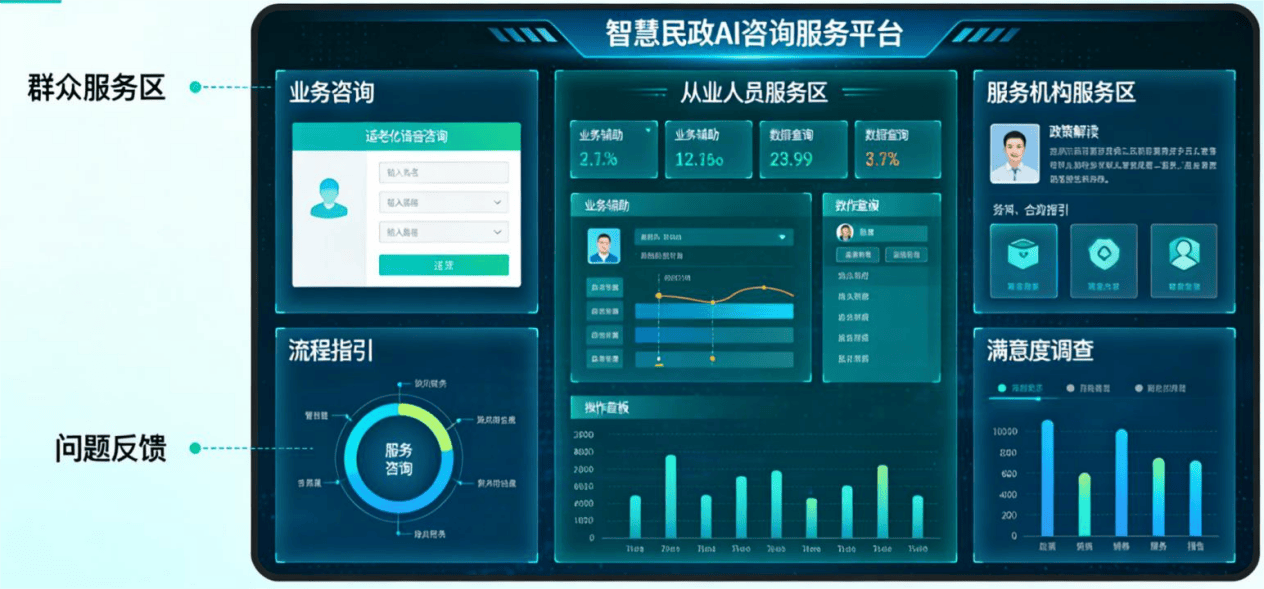 平易近政工做关乎平易近生、连着,全面笼盖养老补助、特困救帮、殡葬收费、公益岗亭补助等各类资金的出入明细、审批流程、受益对象消息等,为AI阐发研判供给的数据根本。系统可监测其办事流程、收费尺度、办事规范等,及时同步资金出入、政策调整等相关消息,及时发觉资金利用不合理、违规违纪等问题,同时,为平易近政工做人员供给营业辅帮、数据查询办事。整合AI机械人、AI征询引擎、AI数据阐发等焦点手艺,环绕三大焦点需求建立监管系统,AI机械人可从动转接人工坐席,系统可及时监测办事机构的运营动态,